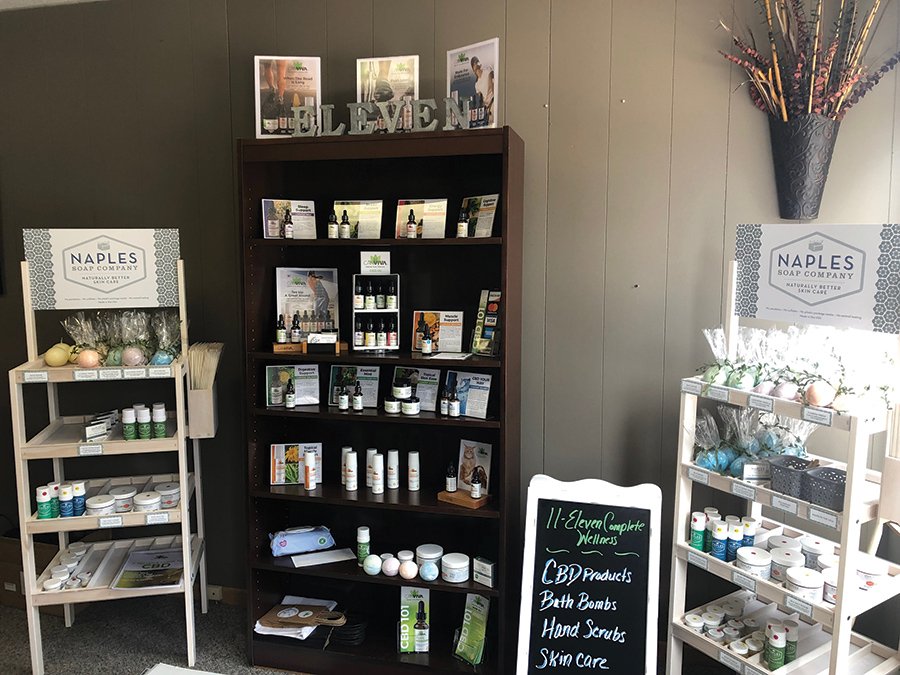 In addition, 11-eleven Wellness carries non-CBD wellness products such as Naples Soap Company sea salt scrub, muscle balm and face cream. Steidl says they plan to add Eastern wellness services like cupping, dry needling, acupuncture and possibly a cannabis nurse on staff.