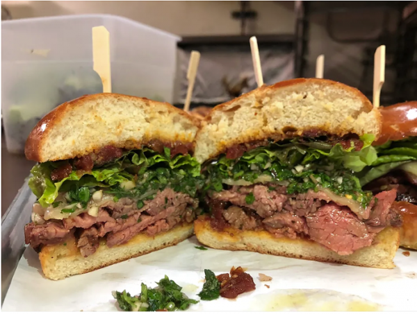 At long last: The highly anticipated Jewish deli from Jonathan Silverberg (owner of the latke-sandwich food truck Napkin Friends), which was first announced in December 2017, finally opened its doors on Thursday. With a tagline that promises food “steeped in tradition—never stuck in it,” guests can expect playful sandwiches like the “Flavor Bomb” (smoked tri-tip, spiced tomato jam, romaine, shaved yellow onion, chimichurri, and manchego on a house-made challah roll), the “Schmaltztastic” (schmaltzy buffalo smoked chicken thighs, apple and fennel slaw, sour cream and onion chips, and pepper jack cheese on challah), and the “Jewish Guilt” (applewood-smoked bacon, lettuce, tomato, smoked gouda, avocado, and peppadew aioli on sourdough). There are also a few latke sandwiches from the Napkin Friends menu, salads, latkes, matzo ball soup, breakfast sandwiches, and bagels with shmears.