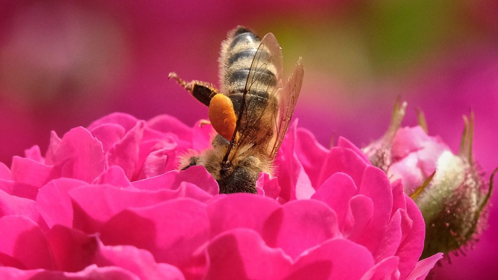 A bee draws nectar from the flowers of a rose bush in a garden outside Moscow.Yuri Kadobnov/Getty