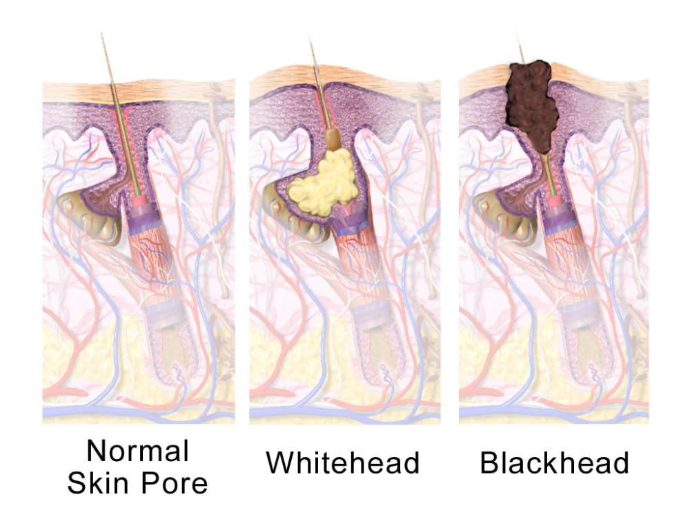 Hair follicle anatomy demonstrating a healthy hair follicle (pictured left), a whitehead or closed comedo (middle picture), and a blackhead or open comedo (pictured right).   WikiJournal of Medicine CC BY 3.0