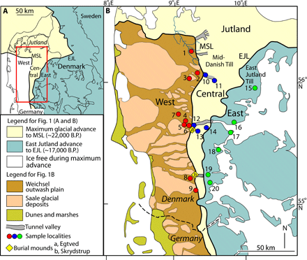 (A) Map showing the position of the MSL and the EJL, indicating the maximum extent of the Weichselian ice sheet in Denmark and the maximum advance of the East Jutland Till, respectively. The red rectangle marks the geographic location of the map in (B). (B) The MSL and EJL subdivide Jutland into three glaciogenic provinces: West Jutland (West), Central Jutland (Central), and East Jutland (East). The distribution is indicated in West Jutland of “Hill Islands” (Saale glacial deposits) and Weichsel outwash plains. Sample localities 1 to 20 are marked. Red dots denote samples obtained in West Jutland, blue dots denote those in Central Jutland, and green dots denote those in East Jutland. Maps are based on (17, 18). B.P., before the present.