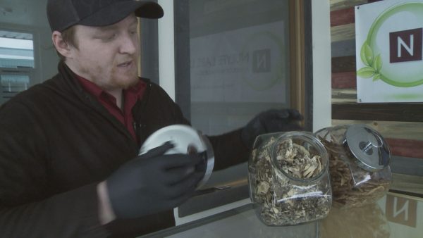 “Right here, we have a variety of different mushroom extracts, and plant extracts: bamboo extract, Ashwagandha root, reishi mushrooms, shitake mushrooms,” Dellapietro said, leaning over a showcase at his Wasilla store.