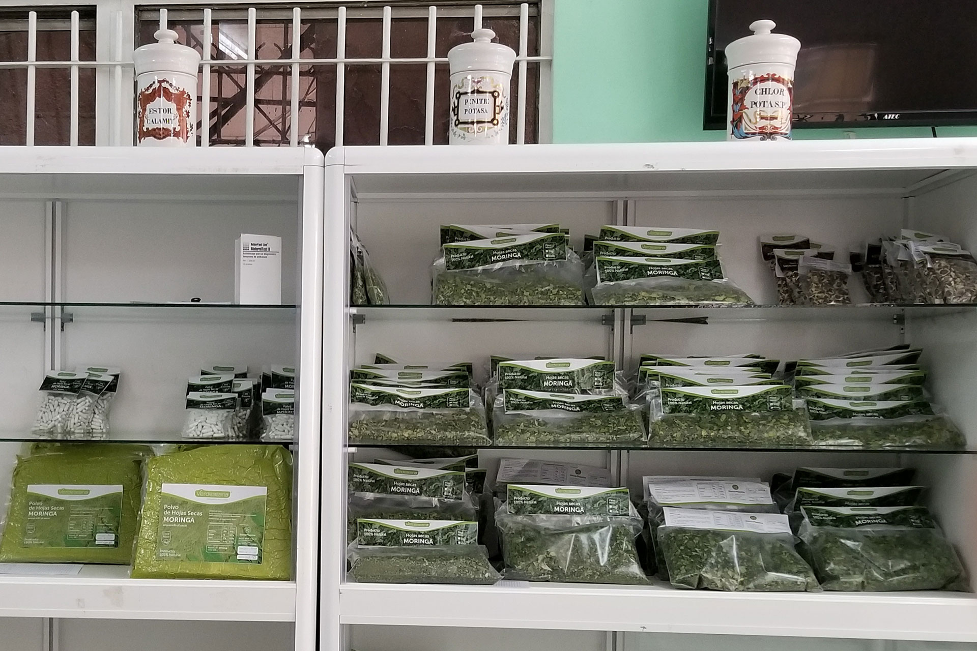 But the shelves that line the back wall are not stocked with the sort of pills and ointments that a typical dispensary would have. Instead, they’re filled with bags and bottles of various forms of the drumstick tree, called “moringa” in Spanish.