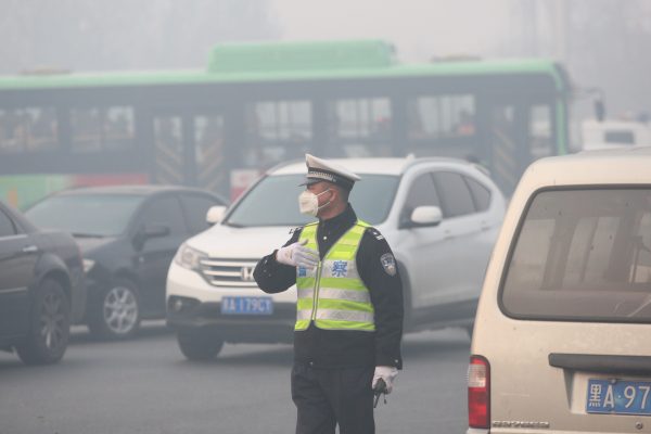A traffic policeman wearing a face mask directs in heavy smog on in Harbin, Heilongjiang Province of China.