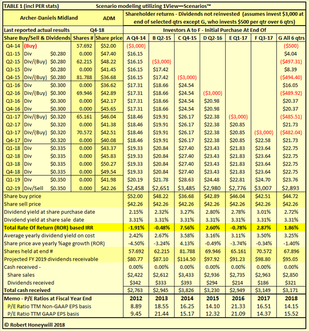 What I need to do now is undertake the process of determining whether a purchase of ADM shares at current prevailing prices is likely to provide an acceptable rate of return going forward. This process requires a look at the past, and quantification of a range of future expectations for ADM. TABLE 1 below summarizes a sampling of results from investing in ADM over the last 4 to 5 years and exiting at the current low share price.