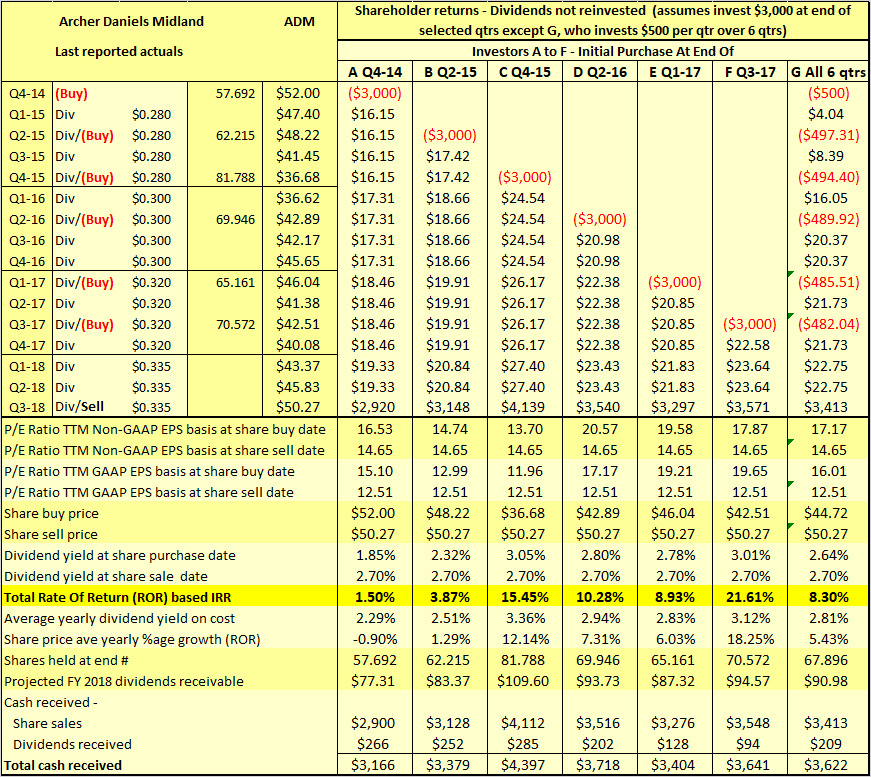 What I need to do now is undertake the process of determining whether a purchase of ADM shares at current prevailing prices is likely to provide an acceptable rate of return going forward. This process requires a look at the past, and quantification of a range of future expectations for ADM. TABLE 1 below summarizes a sampling of results from investing in ADM over the last 4 to 5 years and exiting at the current low share price.