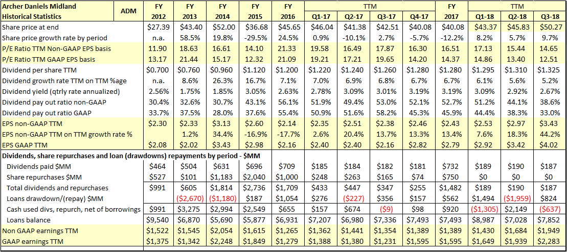 Where the analysts weighted average consensus forecasts do not add to the equivalent full year EPS, the quarterly EPS is adjusted per the “Adopt” column. The EPS amounts per the “Adopt” column in TABLE 2 above have been used in the Dashboard Base projections further below. In addition, dividend increases have been input at a rate of $0.015 increase to the quarterly rate effective in the first quarter of each year. TABLE 3 below summarizes various historical financial data for ADM for purposes of comparison when assessing the reasonableness of our dashboard projections.