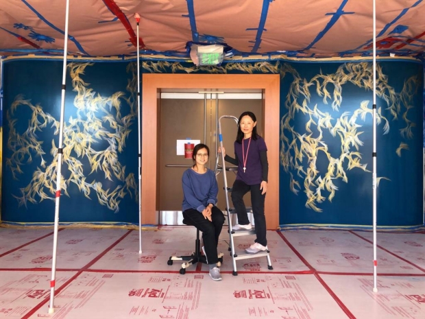 Artist Jinnie Seo (right) and studio assistant Jihyun Lee during the production of the “Rays of Hope” mural commissioned by Stanford Health Care for the interfaith chapel.