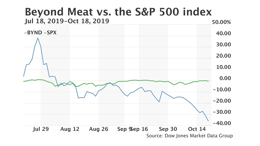 Beyond Meat BYND, -6.27% shares have risen sharply from the $25 IPO price to more than $111 on Friday. However, the stock has dropped 34.4% over the past three months. It began trading on May 2.