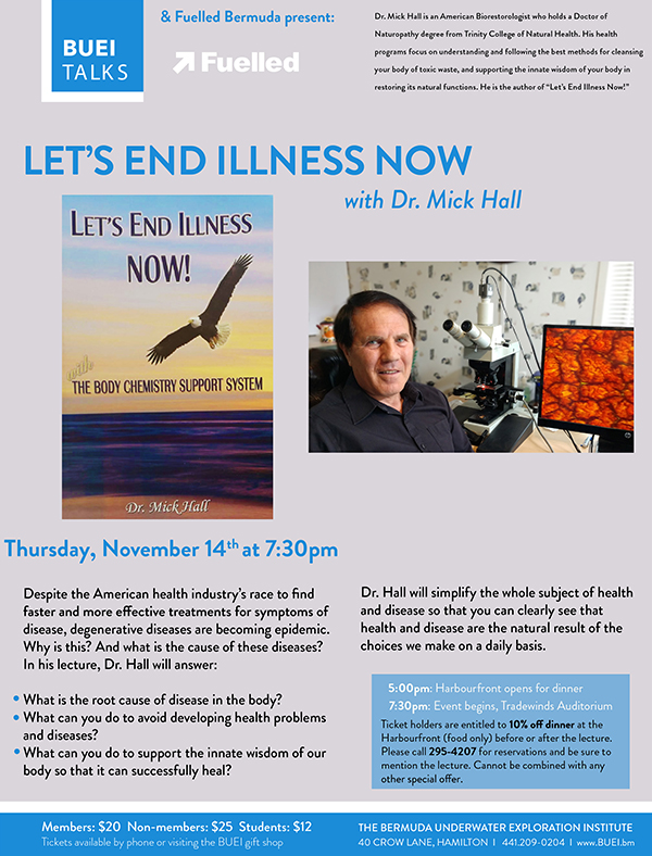 The Bermuda Underwater Exploration Institute will present a talk entitled “Let’s End Illness Now!” with Dr. Mick Hall on Thursday, November 14th at 7:30 pm.