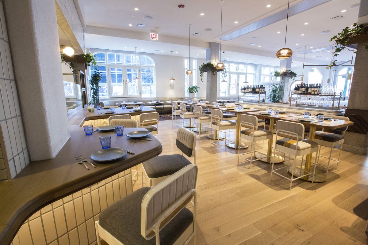 These elements divide the cavernous space without interrupting the airy, open vibe, but Kennedy also says they contribute to a residential theme, helping diners feel especially welcome in homey little pockets throughout the restaurant. (While this isn’t a direct reference to California cuisine progenitor Chez Panisse in Berkeley, domesticity is key to both restaurant concepts. Waters has said she opened the restaurant in a former house in 1971 to offer refuge from the era’s political turbulence, creating comfort with furniture and tableware from flea markets.) Compared to Waters’ vintage furnishings, PST appears sleek and even cold. But the elegant, minimal furniture and decoration still conjure home, at least aspirationally, for many modern diners.