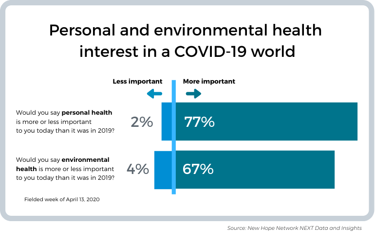Surveyed by New Hope Network through the Suzy research platform, 77% of consumers said their personal health was more important than it was a year ago, compared with 2% who said they were less concerned. That’s not surprising given the nature of the current crisis. Interestingly, concern about environmental health also has risen dramatically, with 67% of respondents indicating it is more important to them than a year ago and only 4% calling it less important.