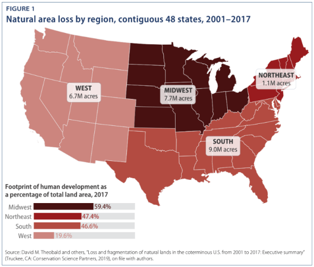 Natural landscapes disappeared fastest in the South — 9 million acres, leaving 46% of the region covered by “human footprint” — and Midwest — 7.7 million acres, with a total of 59% of the region covered — according to the report. In the Northeast, development led to the loss of 1.1 million acres, putting 47% of the region under the “human footprint.”