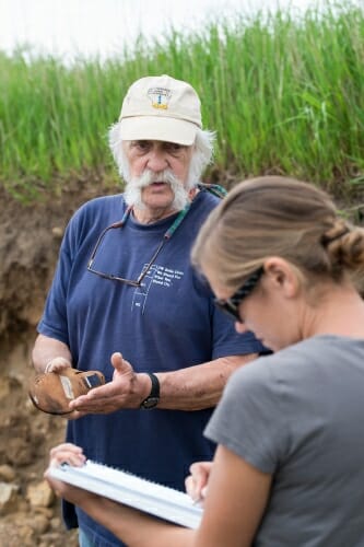 Fred Madison described layered features of vertically exposed prairie soil during a soil science class field trip in 2014. Photo: Jeff Miller