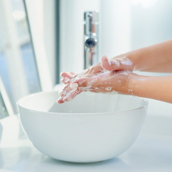 - Then, turn the water back on and place your hands beneath the tap and rinse thoroughly, until all soap has been washed away and the water in the basin is clear. Ensure that the water is flowing down into the sink, so that soapy water does not linger on your wrists or drip down your arms, as this can spread germs elsewhere on your body.