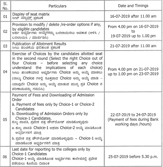 The UGCET 2019 second round option entry and seat allotment schedule for Engineering, Architecture, B-Pharma, Pharma-D and Farm Sciences (Agriculture, Veterinary etc.) will be conducted as mentioned below