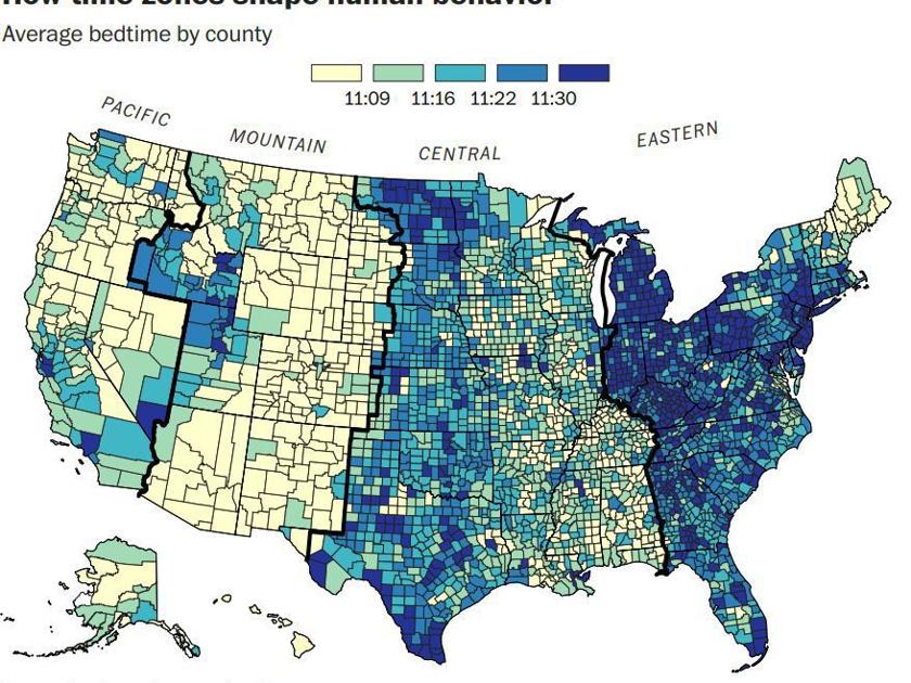 To understand the study, co-authored by Osea Giuntella of the University of Pittsburgh and Fabrizio Mazzonna of the Universita della Svizzera Italiana, it is important to understand how time zones affect local sunset times. Traveling east to west, sunrise and sunset times get later, as the map above shows.