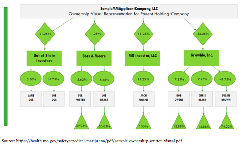 Recently, in connection with the rejection of many medical marijuana facility license applications as “incomplete,” the Missouri Department of Health and Senior Services (DHSS) issued a Sample Ownership Visual Representation, which is a fancy name for a sample organizational chart, “[f]or assistance with the Ownership Structure Form” included in DHSS’ standard marijuana facility application packet. The Sample is below: