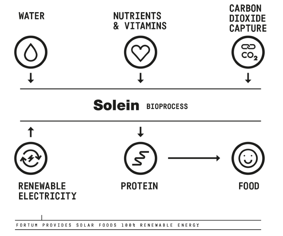 Solar Foods makes Solein by extracting CO₂ from air using carbon-capture technology, and then combines it with water, nutrients and vitamins, using 100 percent renewable solar energy from partner Fortum to promote a natural fermentation process similar to the one that produces yeast and lactic acid bacteria.