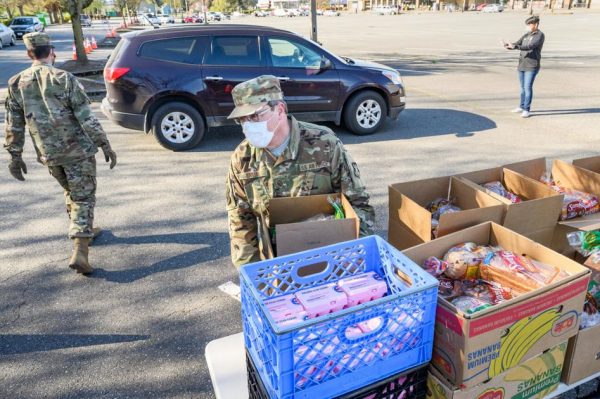 The face masks, gloves and uniforms worn by members of the state National Guard, as they loaded boxes of food Thursday from the Helping Hands Solution Center into a growing number of vehicles, are a stark reminder that while progress is being made in the battle against COVID-19, the war is far from over.