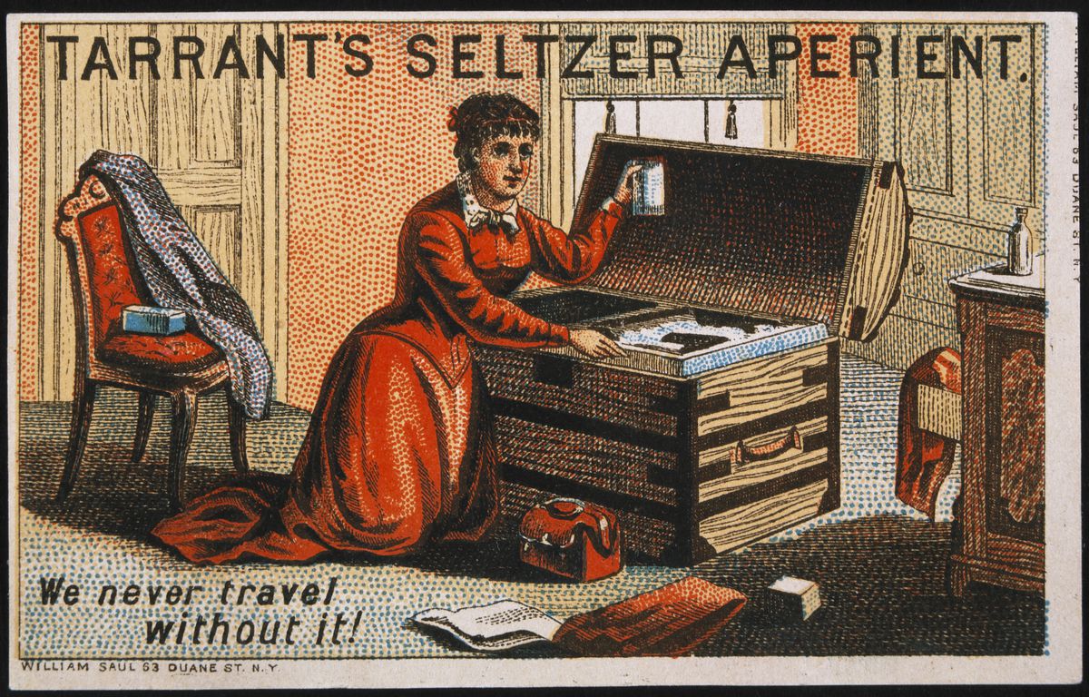 With bottling, the spa could come to you, and so seltzer became the luxury-healing hybrid, like the 19th century version of wheatgrass shots. Schweppes, the first seltzer bottler in England, promised it could “reduce fever, ease ‘biliousness’ (indigestion), and address nervous afflictions and ‘the debilitating consequences of hard living,” Joseph writes.