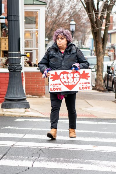 Soon, Weinstein found herself expanding her walking territory beyond Main Street shops, the Doylestown Farmers’ Market and local memorial events and social justice gatherings. She started carrying a simple, sign that read, “HugMobsters Armed with Love.”