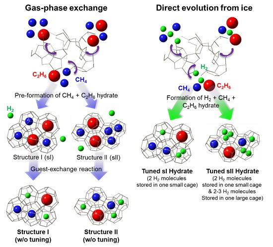 The research team found that two hydrogen molecules are stored in small cages in tuned structure I hydrates, while up to three hydrogen molecules can be stored in both small and large cages in tuned structure II hydrates. Hydrates can store gas up to about 170-times its volume and the natural gas used as thermodynamic stabilizers in this study can also be used as an energy source.