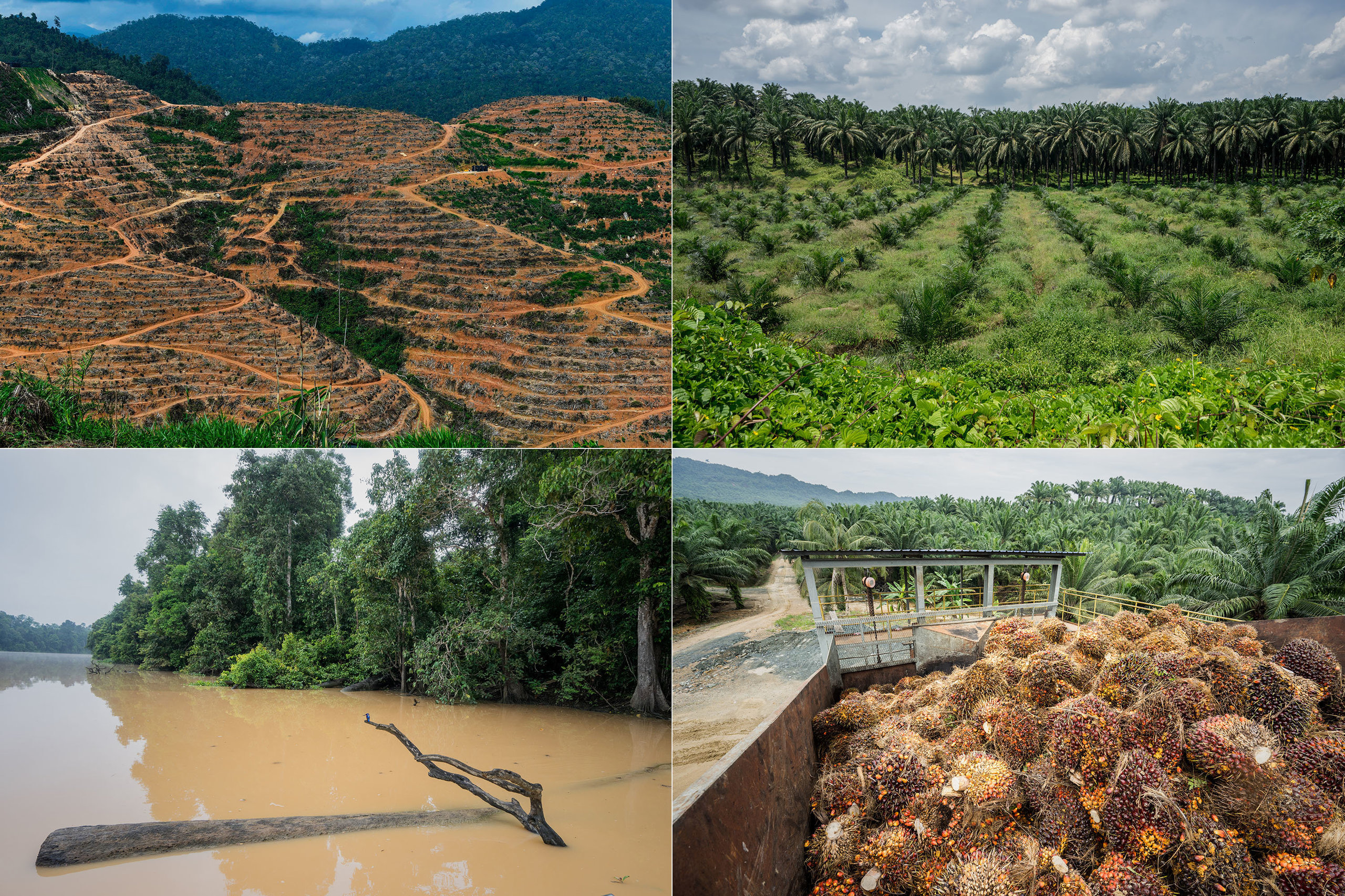 Right bottom: A palm oil plantation and factory in Sabah, Malaysia.