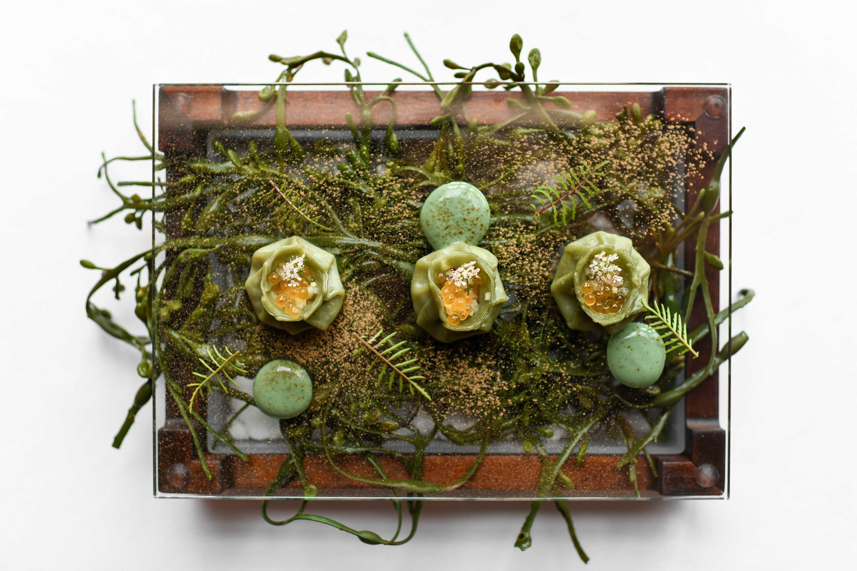 Part of the eight-course tasting menu is an oyster dish with xao long bao, cucumber dashi, tosaka nori, and matsutake shoyu.