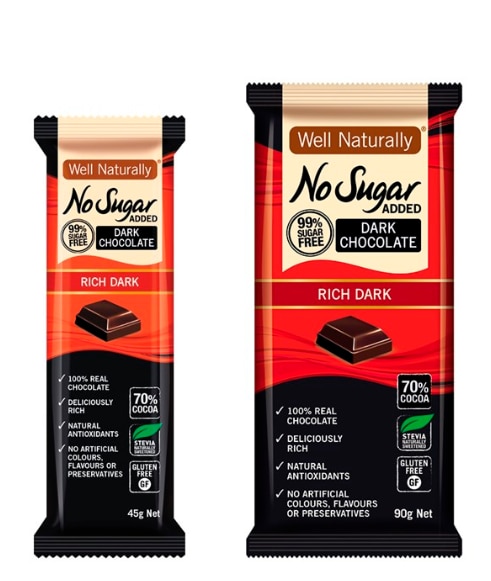 Found in Woolworths, Coles and selected health food stores Well Naturally are one of the leaders in the no sugar chocolate field. Sweetened with stevia, not sugar, they have a whole variety of flavours in their range which comes in 45g and 90g sizes.