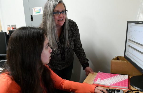 Union College professor Heather Watson looks over computer screens with graduate student Elise Liebon Wednesday, February 12, 2020.