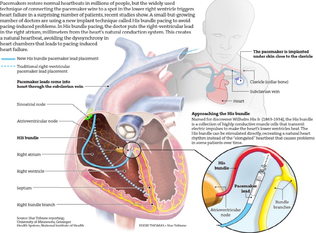 HIS bundle pacing delivers electricity higher in the heart, so that the electric pulses from an implanted device can travel along the natural conduction pathways in the heart, triggering more natural timing in the left ventricle.