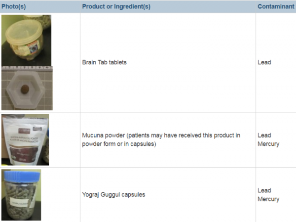Affected products include Brain Tab tablets, mucuna powder and yograj guggul capsules.
