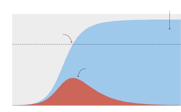 Once enough immunity has been built in the population, each person will infect fewer than one other person, so a new epidemic cannot start afresh. But an epidemic that is already underway will continue to spread. If 100,000 people are infectious at the peak and they each infect 0.9 people, that’s still 90,000 new infections, and more after that. A runaway train doesn’t stop the instant the track begins to slope uphill, and a rapidly spreading virus doesn’t stop right when herd immunity is attained.