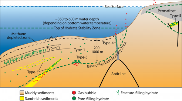 Natural gas hydrate deposits can be categorized into several types depending on where they are found, how they form, and their physical properties.